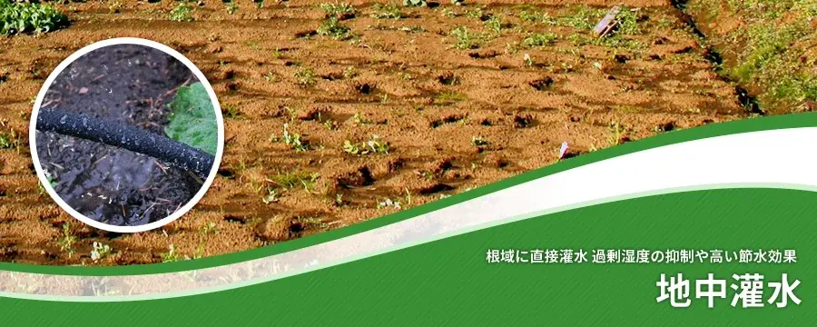多孔質のゴムチューブを地中に埋設し、作物の根群域(こんぐんいき)に水・空気・肥料を供給する方式です。均一な水分供給が可能であり、長期的な使用にも耐えうる耐久性があります。