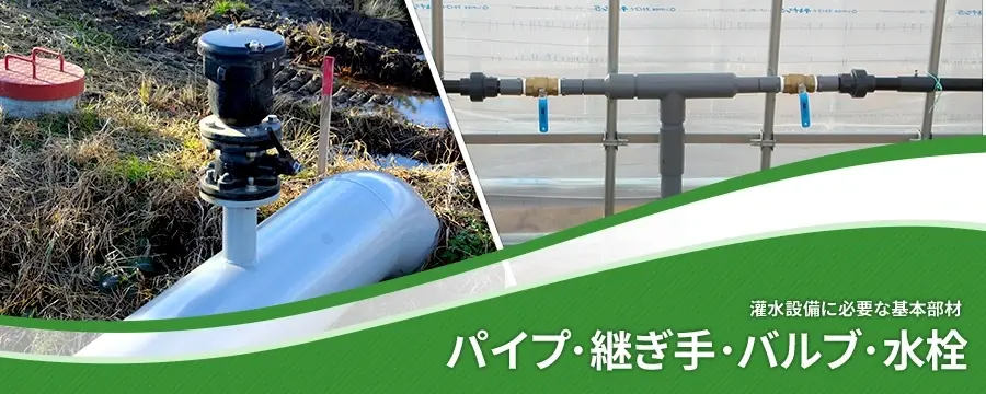 灌水設備に必要な基本部材。配管用の塩ビパイプ、手動バルブ等を掲載しています。
