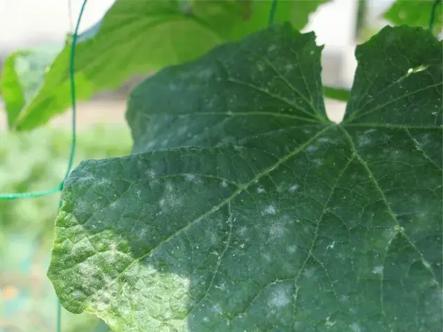 キュウリの葉にできたうどん粉病