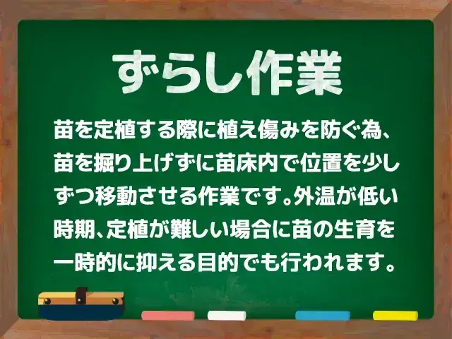 ずらしには、主に「定植準備ずらし」と「生育抑制ずらし」の2つの種類があります。定植準備ずらしは、苗を掘り上げることなく苗床内で位置をずらすことで、定植時の植え傷みを減らすことを目的としています。生育抑制ずらしは、外温が低い時期やその他の事情で定植が難しい場合に、苗の生育を一時的に抑えるために行われます。