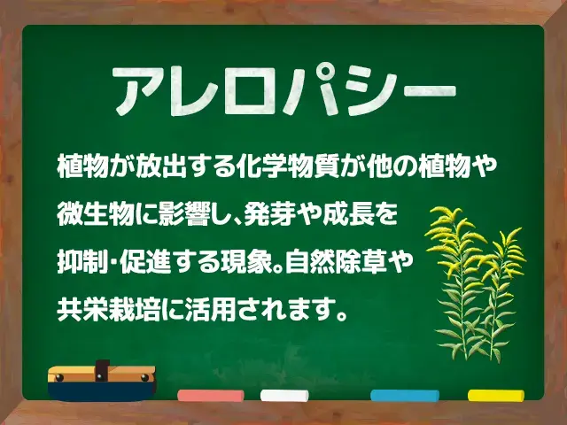 アレロパシー(あれろぱしー)とは、植物が根や葉から放出する化学物質によって、他の植物や微生物、害虫などの発芽や成長を抑制・促進する現象です。