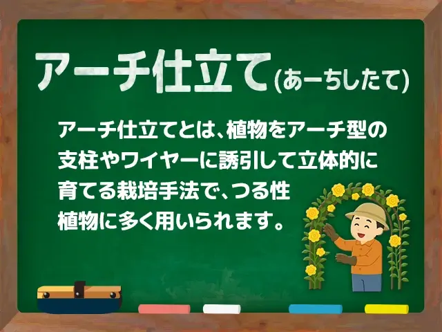 同意語としては「アーチ誘引」「トンネル仕立て」などが用いられます。