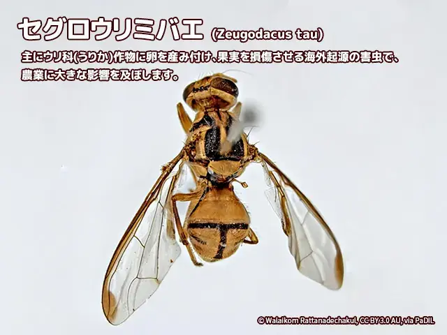 セグロウリミバエは、学名Zeugodacus cucurbitaeに分類される昆虫で、熱帯から亜熱帯地域を中心に分布しています。日本では令和6年以降、沖縄や中部地方などでその存在が確認されています。