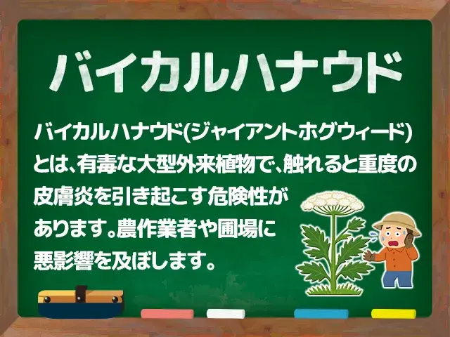 バイカルハナウドの樹液は皮膚に付着して紫外線を浴びることで激しい皮膚炎を引き起こします。農作業や草刈り作業時に不用意に触れてしまうリスクが高いため、問題となります。