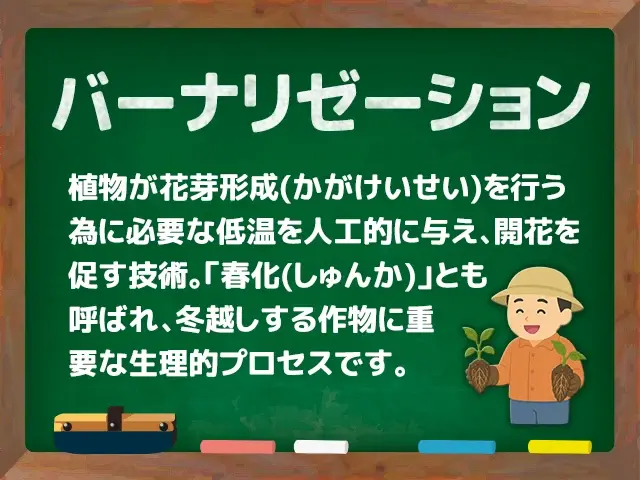 「バーナリゼーション」は英語で vernalization といいます。語源はラテン語の「ver」(春)に由来し、植物が花を咲かせるために一定の低温にさらされる必要がある生理現象や、その処理を指します。農業や植物生理学の専門用語として広く用いられています。