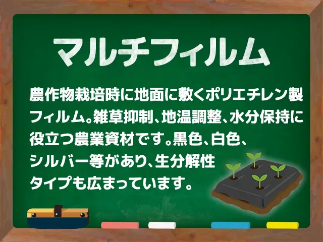 マルチフィルムとは、作物を育てる土壌表面を覆うために敷かれるフィルムで、一般にはポリエチレンや生分解性素材から作られています。畑やビニールハウスの栽培環境を安定させる目的で使用され、農作業の効率化にもつながります。