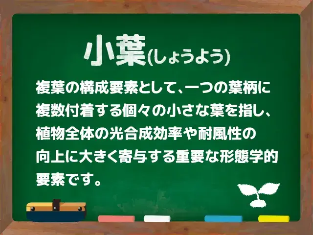 小葉は、複葉植物の葉柄に付属し、複数の小さな葉がまとまって一つの大きな葉のように見える構造です。この特徴的な形態は、植物がより広い範囲で日光を受け止めるための工夫として発達しており、光合成の効率向上に寄与しています。