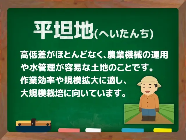 平坦地(へいたんち)とは、地表の傾斜度(けいしゃど)がごく小さく、高低差のない、もしくは非常に少ない耕地を指します。農業分野では、このような土地は機械化や灌漑(かんがい)、整地(せいち)の観点から大変利便性が高く、特に大規模な作付けを行う際に重要な役割を果たします。