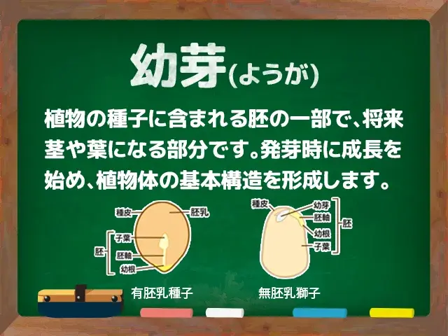 幼芽は、種子に含まれる胚の中でも茎や葉に分化する予定の器官です。