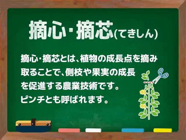 摘心・摘芯(てきしん)とは、植物の主幹や枝の成長点を摘み取る農業技術です。この技術は、植物の成長を制御し、望ましい形状や収量を得るために用いられます。摘心により、植物のエネルギーは側枝や果実の成長に集中し、全体の生育が均等になることが期待されます。同意語としては「ピンチ」「ピンチング」があります。