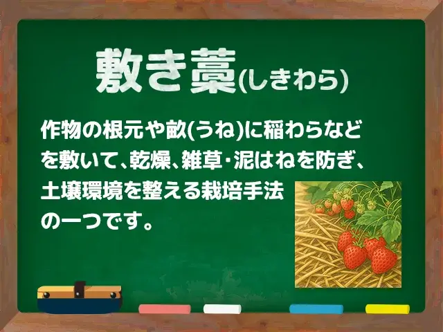 敷き藁(しきわら)とは、植物の株元や畝の表面に稲わらや麦わらを敷くことで、土壌の乾燥を防ぎ、雑草の発生を抑えるとともに、泥はねや地温の急激な変化から作物を守る農業技術です。