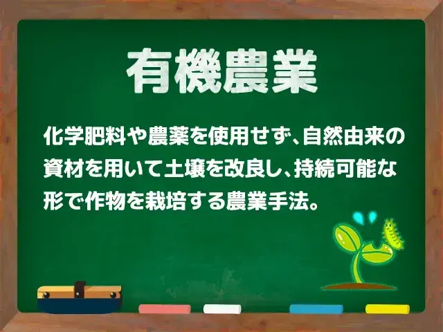 有機農業(ゆうきのうぎょう)とは、化学肥料や農薬を使用せず、自然由来の資材や方法を利用して、環境や生態系に配慮しながら作物を栽培する農業手法です。主に堆肥(たいひ)や緑肥(りょくひ)、輪作(りんさく)などを駆使して、土壌の健康を保ちながら作物の生産を行います。有機農業は、環境保護や消費者の健康を重視する観点から世界中で注目されており、その実践には長期的な視点と持続可能性が求められます。同意語としては「オーガニック農業」があります。