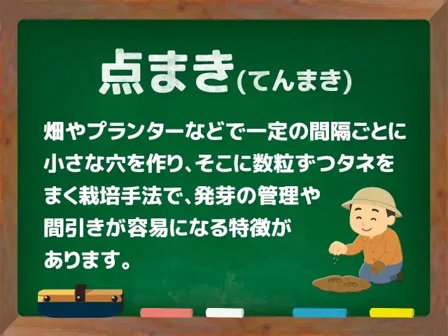 点まき(てんまき)とは、タネまきの手法の一つであり、野菜栽培をはじめとした農業現場で非常に多用されています。 畑やプランターなどで、くわや手などを使って小幅の溝や小穴を作り、一定の間隔ごとに数粒ずつタネをまく方法を指します。