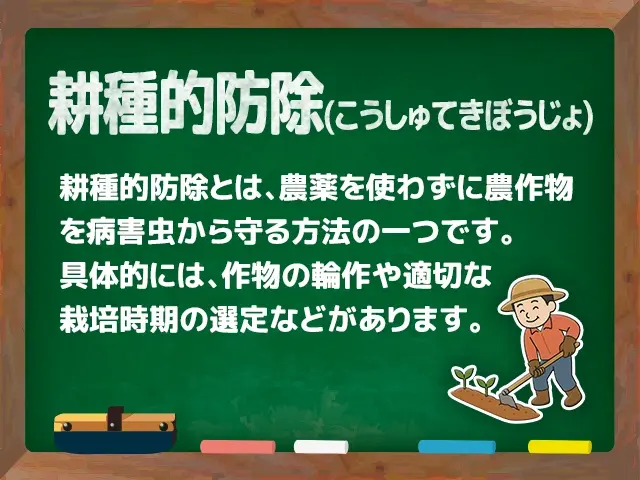 耕種的防除(こうしゅてきぼうじょ)とは、農薬に頼らず、作物の栽培方法や環境の整備によって病害虫や雑草の発生を未然に抑える防除技術のことです。