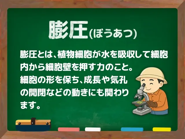 膨圧(ぼうあつ)とは、植物細胞が外部から水を取り込むことにより細胞の内部に生じる圧力であり、細胞壁を内側から押し広げる力のことを指します。