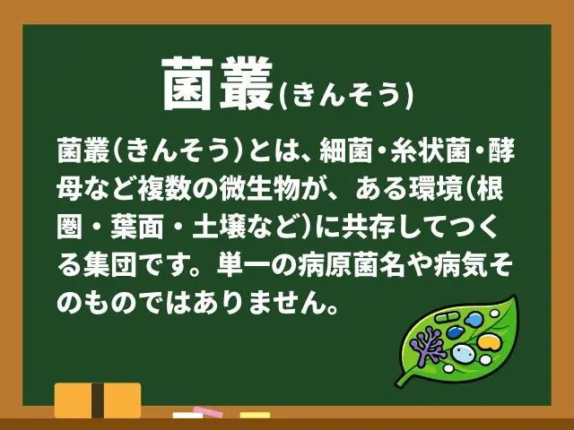 菌叢(きんそう)とは、【微生物生態・植物病理・土壌微生物学にまたがる広義カテゴリー】であり、ある環境(根域(こんいき)、葉面(ようめん)、培地(ばいち)、貯蔵(ちょぞう)環境など)に存在する微生物群集(とくに糸状菌(しじょうきん)を中心とした菌のまとまり)と、その群集が形成する状態を指します。菌叢(きんそう)は群集概念であり、単一の病害名・単一の原因菌・特定資材を示す語ではありません。