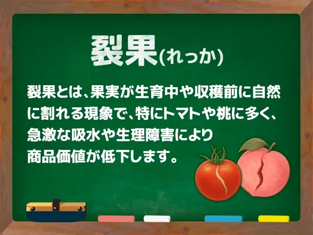 裂果は、栽培環境における水分管理の急変や、品種特性によって引き起こされやすく、トマトやモモ、スイカなどでは日常的な課題となっています。