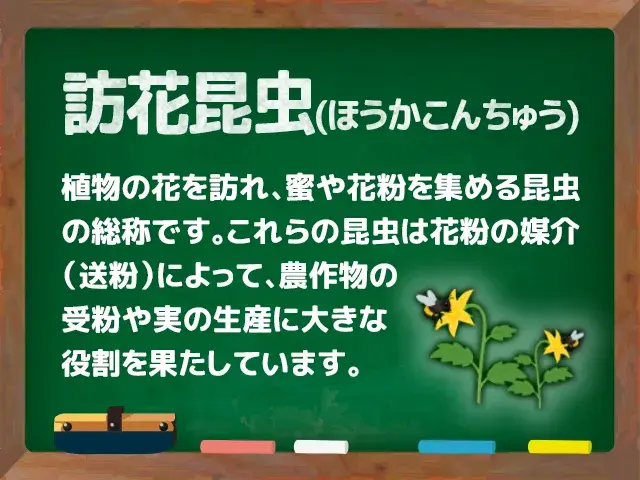 訪花昆虫(ほうかこんちゅう)とは、植物の花を訪れ、蜜や花粉を集めたり、時には花粉を食べたりする多様な昆虫の総称であり、農業現場では「ポリネーター(花粉媒介者)」とも呼ばれます。