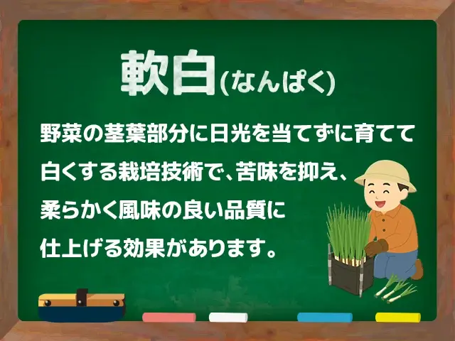 軟白(なんぱく)とは、野菜の茎や葉、時には芽などに日光が当たらないように工夫して栽培することで、葉緑素(ようりょくそ)の生成を抑え、白くやわらかな状態に育てる技術を指します。