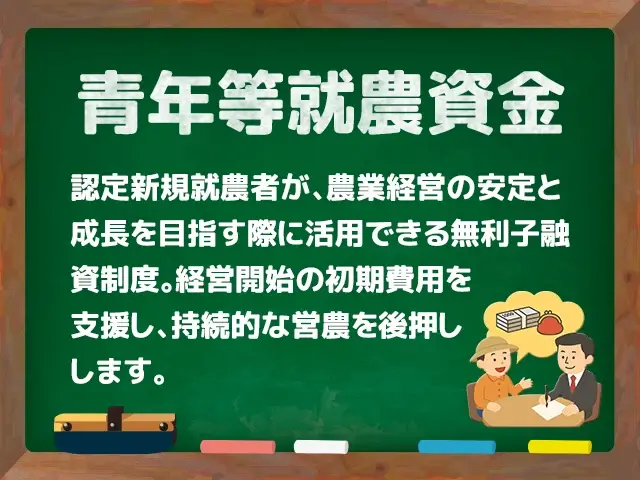 同意語としては「新規就農者資金」「就農支援資金」などがあります。